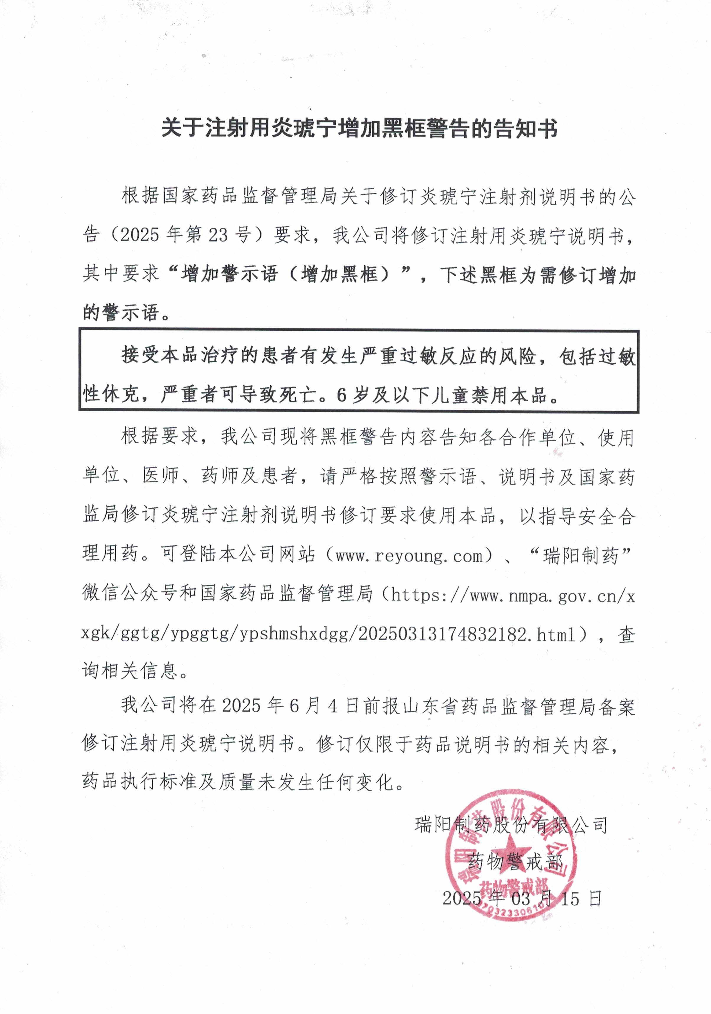 關(guān)于注射用炎琥寧增加黑框警告的告知書
