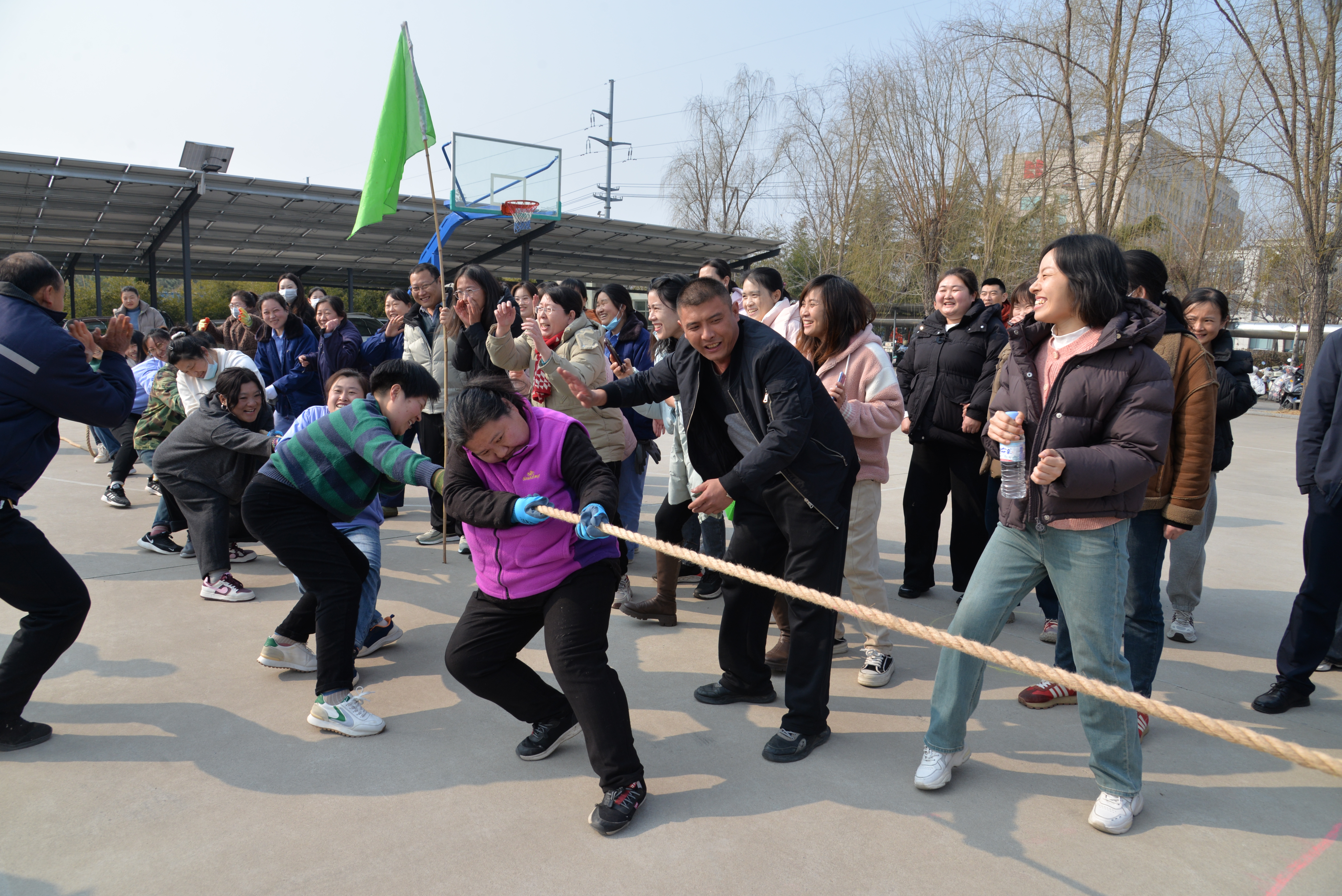 ? 隨后的拔河賽場,女職工們瞬間變身颯爽“女將”。隨著裁判哨響,粗麻繩緊繃如鋼,大家齊心協(xié)力,足蹬大地,身姿穩(wěn)如磐石。啦啦隊(duì)也熱情高漲,加油吶喊聲交織回蕩。經(jīng)過數(shù)輪角逐,六基層一隊(duì)斬獲拔河比賽一等獎(jiǎng)。